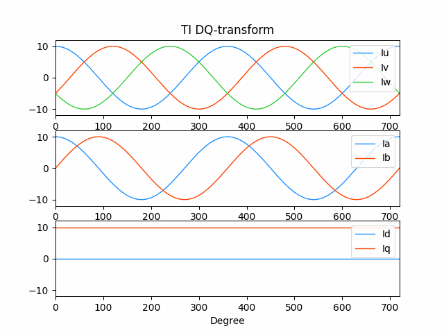 세 번째 그래프를 보자. DQ상은 90˚만큼 떨어져 있으며 반시계 방향으로 회전하고 있다. DQ축은 합성 벡터(하늘색)과 동일한 속도로 회전하고 있기 때문에 DQ상의 크기는 변함없다. 이러한 αβ상에서 DQ상으로의 변환을 "Park 변환"이라 부른다.