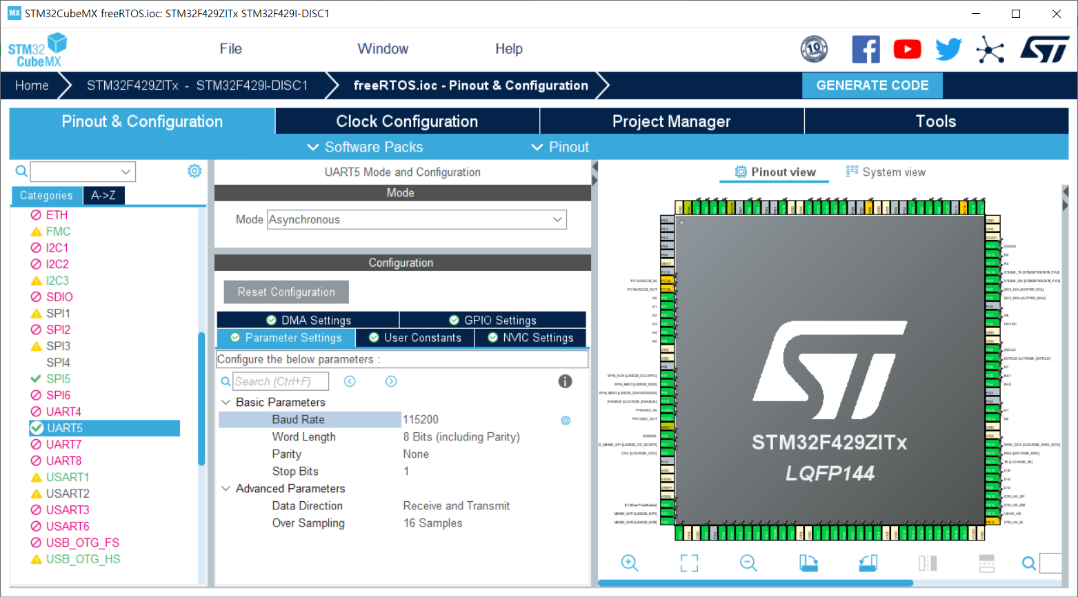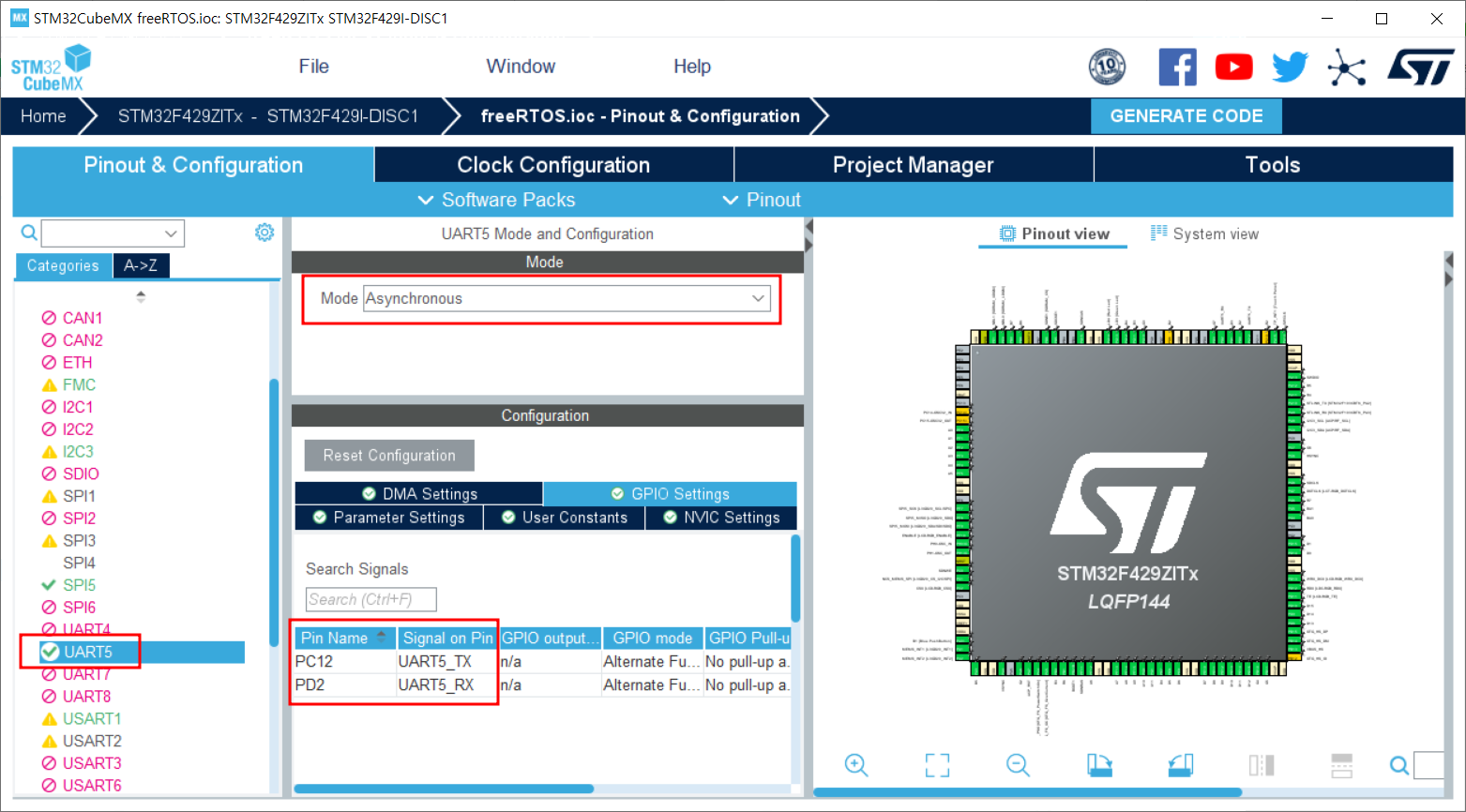 3. UART5를 설정한다. 동기화하지 않는 통신이므로 Asynchronous로 한다.