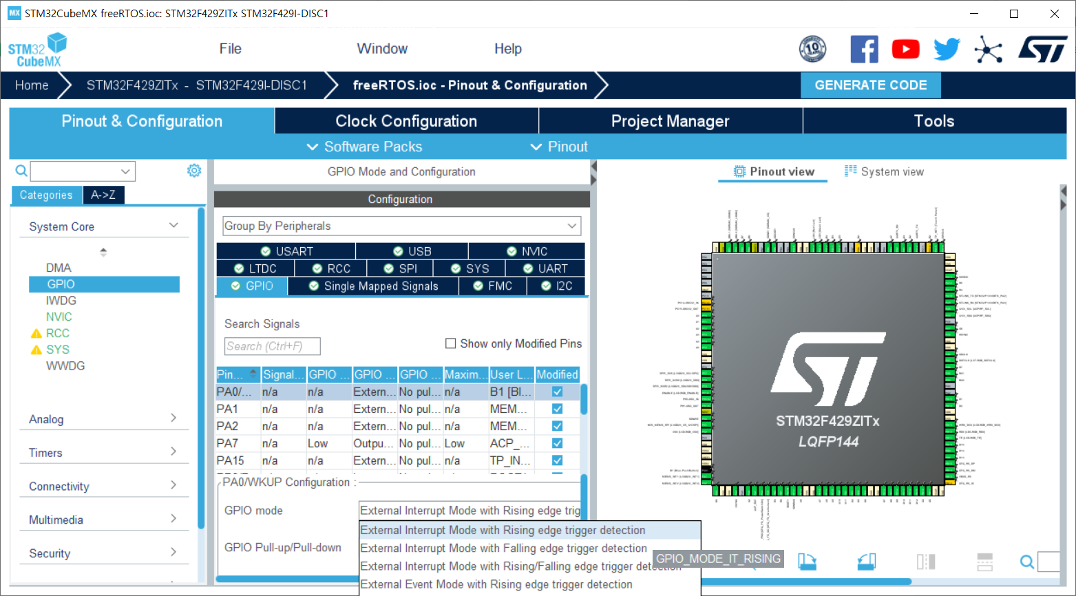 B1은 PA0 핀과 연결되어 있다. 이 때 외부 인터럽트로 설정하여 버튼이 눌려지면 인터럽트가 실행되도록 바꿔보자.