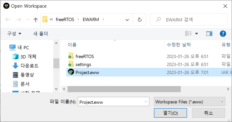 2. 프로젝트 폴더명 아래에 EWARM이라는 폴더에 들어가면 *.eww 확장자의 파일이 존재한다.