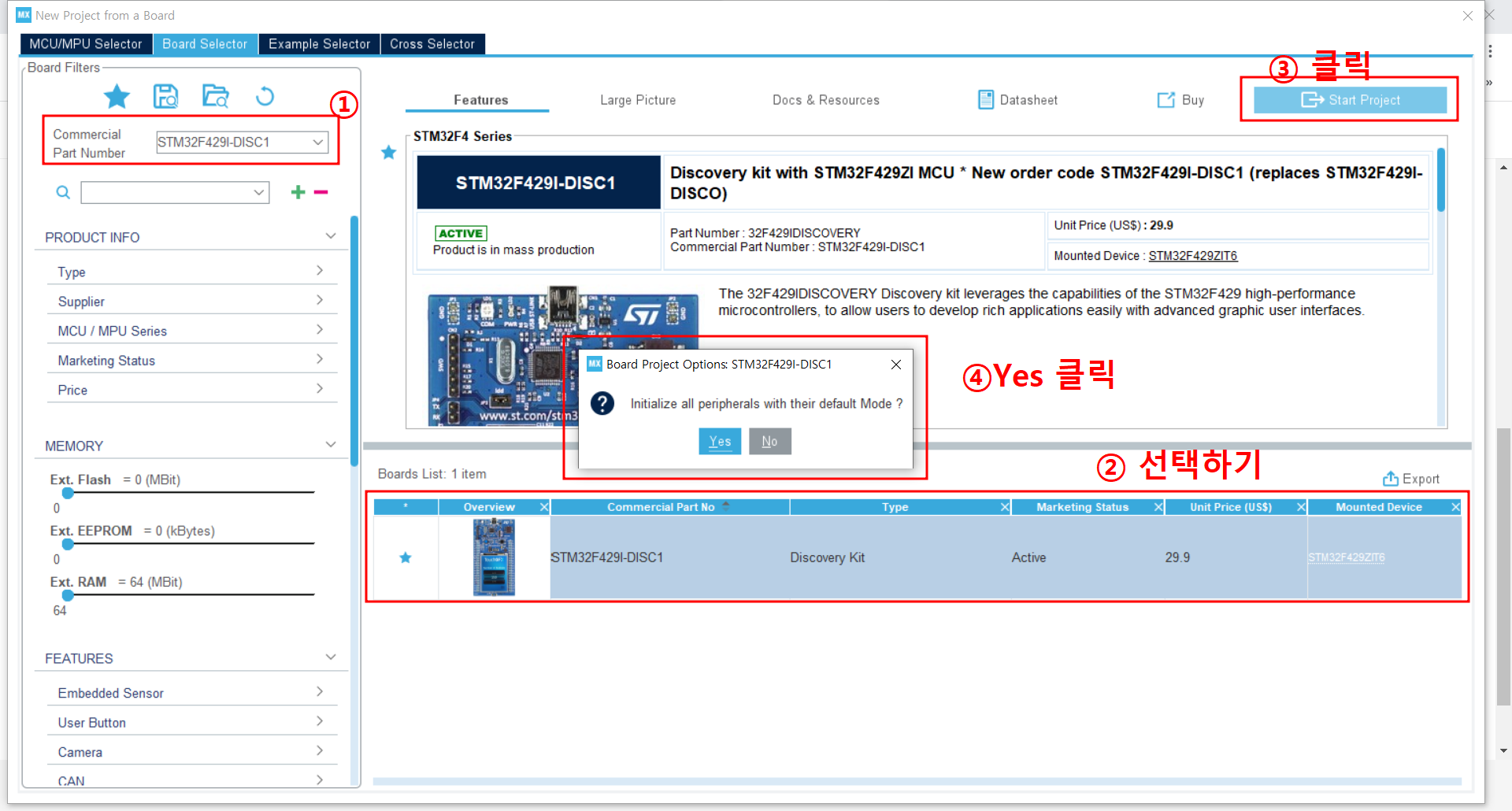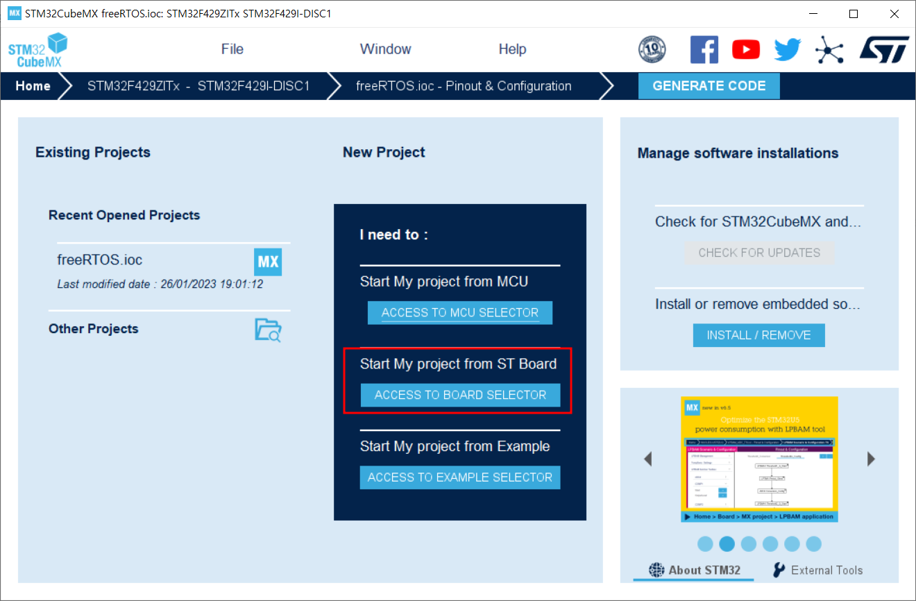 1. CubeMX를 실행하고 빨간 상자의 버튼을 누른다.