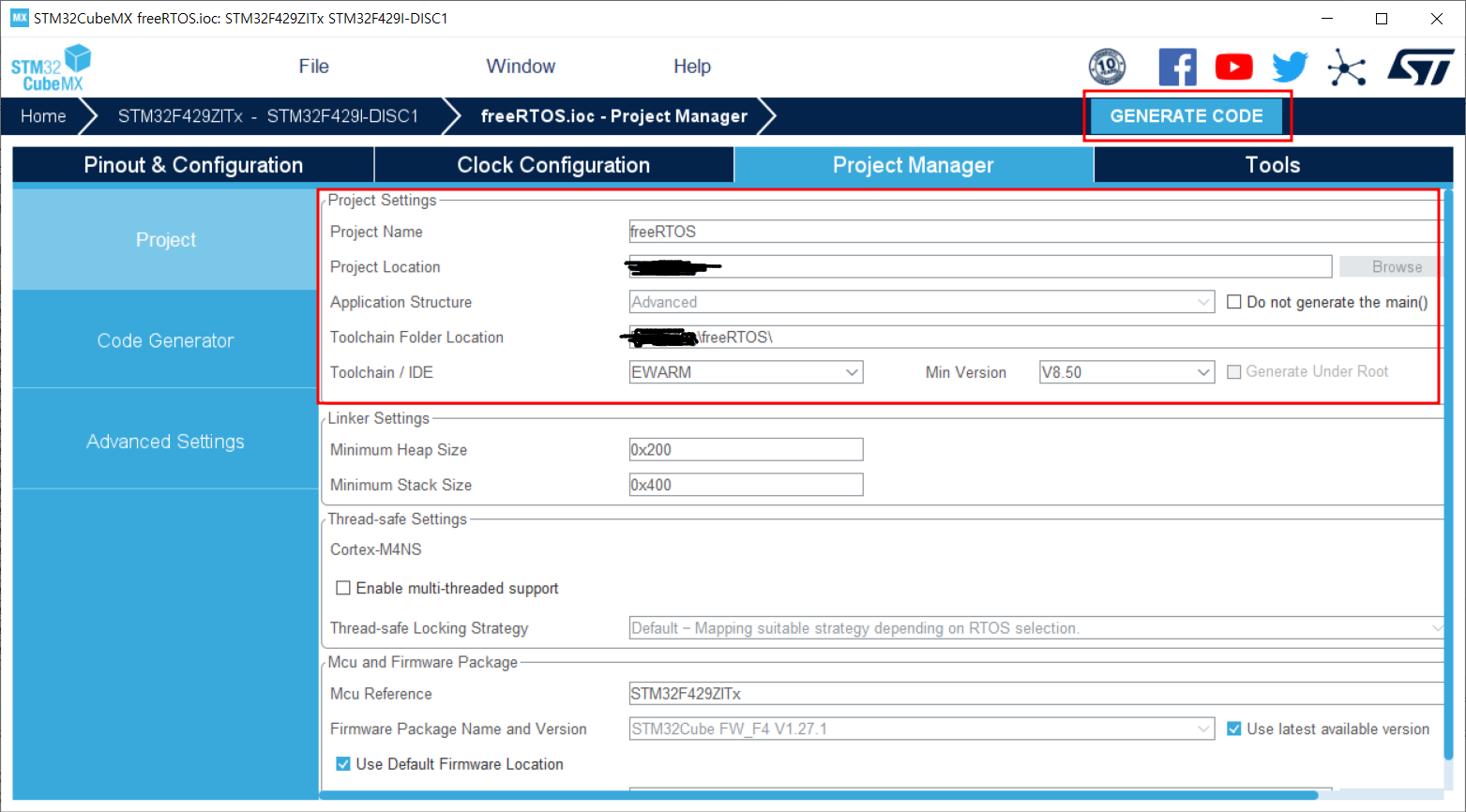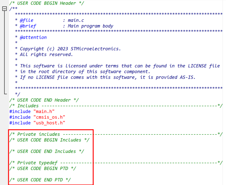 이 영역을 벗어난 곳에 코드를 작성하면 CubeMX에서 "GENERATE CODE"를 클릭할 경우 코드는 증발해버린다.