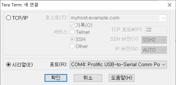두 번째 선택지인 "시리얼"을 선택하고 UART 케이블이 연결된 포트를 선택한다.