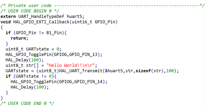 str이라는 배열에 문자열을 넣었으며, UARTstate라는 변수를 통해 통신에 실패할 시 적색 LED가 토글되도록 했다.