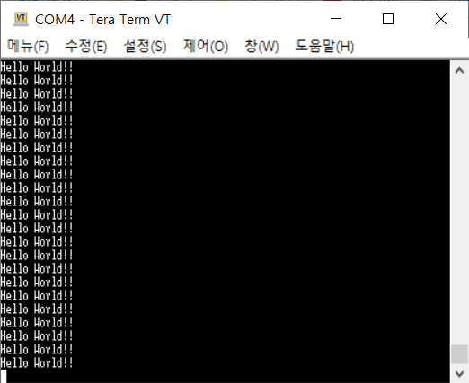 아래는 UART 통신으로 Hello World!!를 출력한 결과이다.