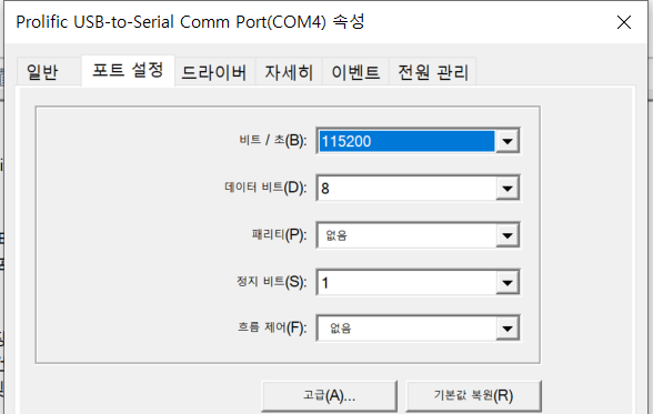 장치 관리자에 들어가서 UART 케이블의 Baudrate를 직접 손보길 바란다.