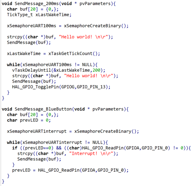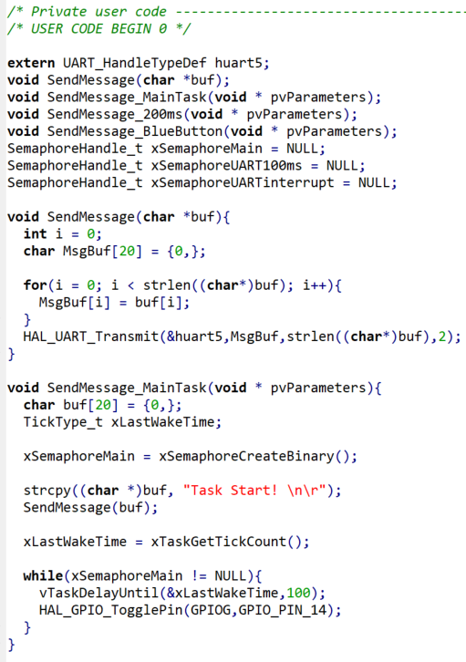 SendMessage_MainTask()에서는 초기에 "Task Start!"을 출력하고, 매 100[ms]마다 적색 LED(PG14)를 토글한다.
