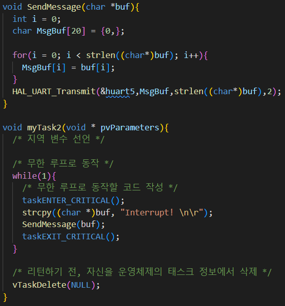 SendMessage라는 공용 함수가 있고, myTask2라는 태스크 함수가 있다.