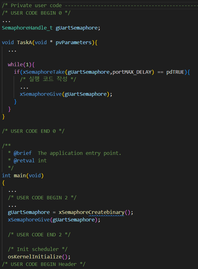 아래와 같이 코드를 작성한다면, TaskA 함수는 매 실행 주기마다 세마포어 열쇠를 얻으면, 작성된 코드대로 실행될 것이다.