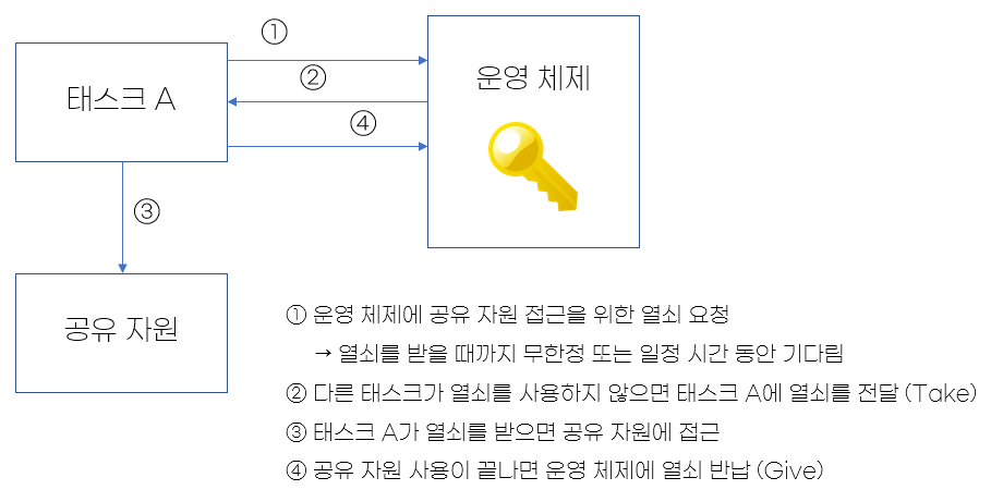 열쇠를 받아서(Take) 공유 자원의 자물쇠를 열고 사용한 다음, 사용이 끝나면 열쇠로 잠그고 열쇠를 반납한다(Give).