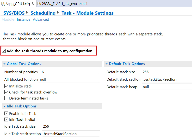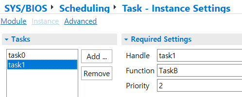 SYS/BIOS → Scheduling → Task → Instance 에서 Task를 추가한다.