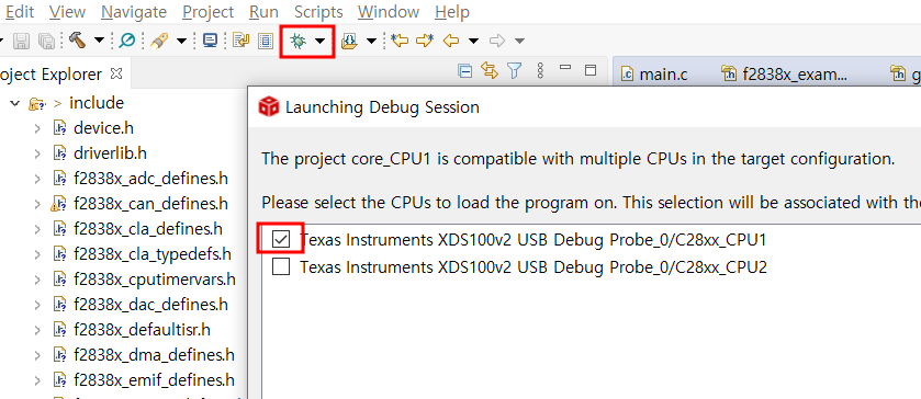- f2838x_codestartbranch.asm(삭제 또는 우클릭 후 Exclude from Build)