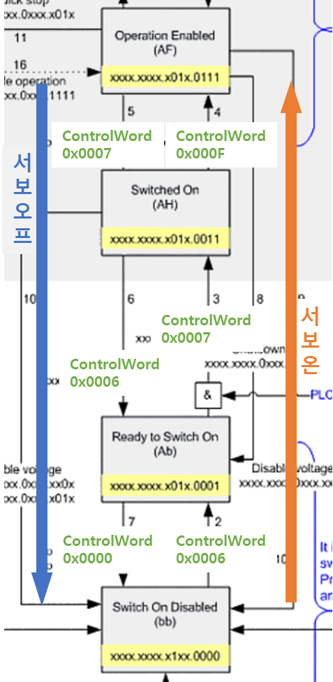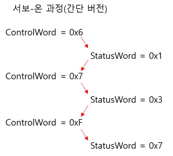 서보 온 과정에서의 ControlWord와 StatusWord의 변화는 다음과 같이 간단히 표현할 수 있다.