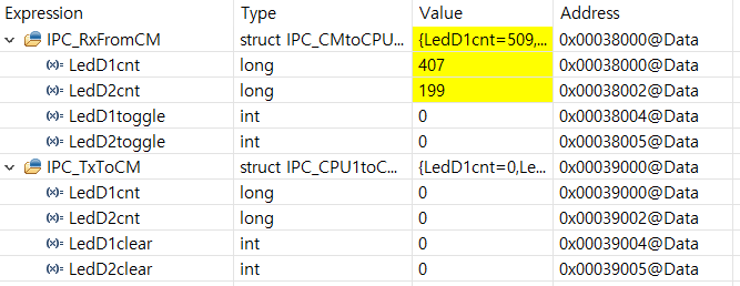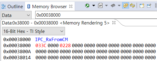 그림 6와 동일하게 0x00038000에 IPC_RxFromCM 이 할당되어 있고, 카운트가 계속 바뀌는 것을 볼 수 있다.
